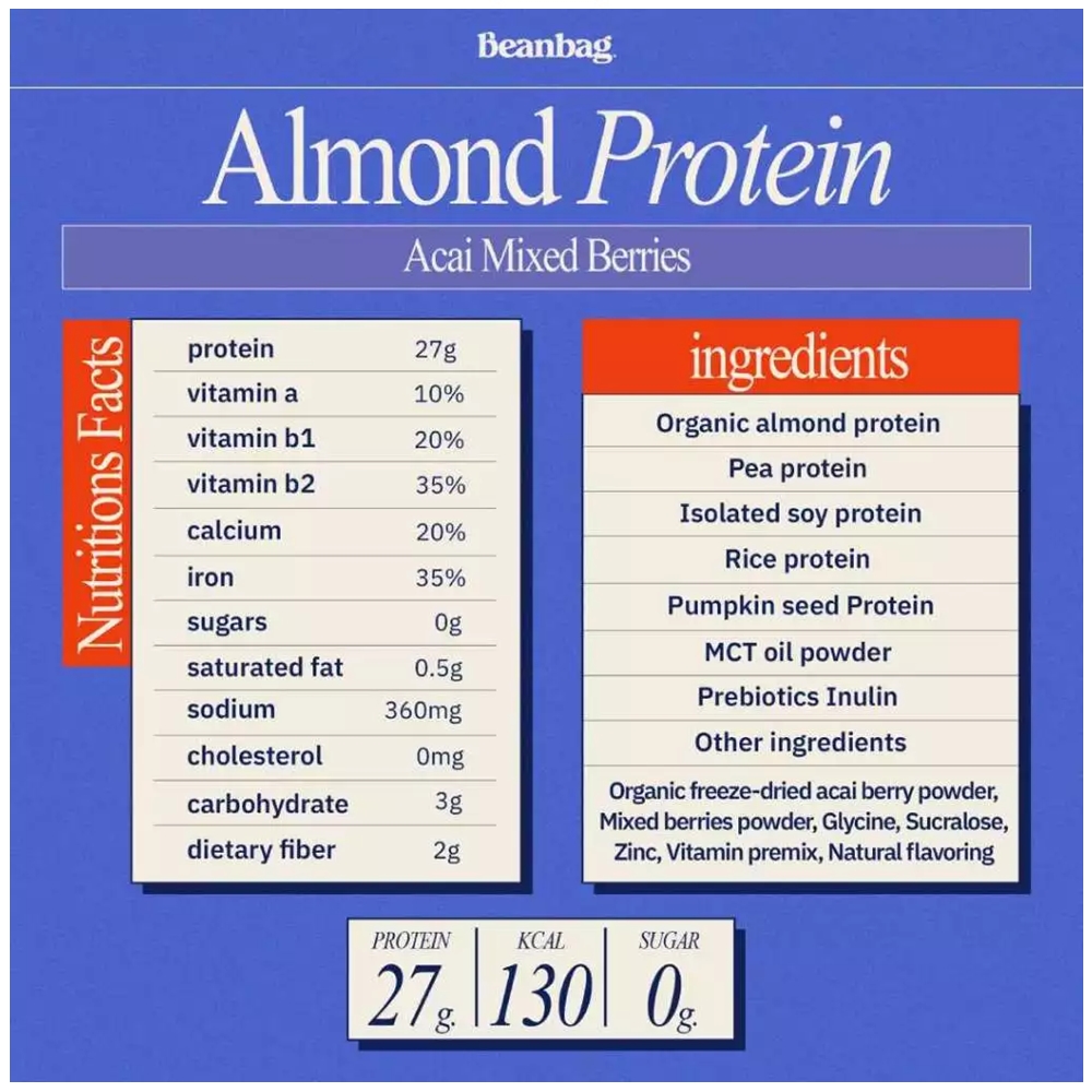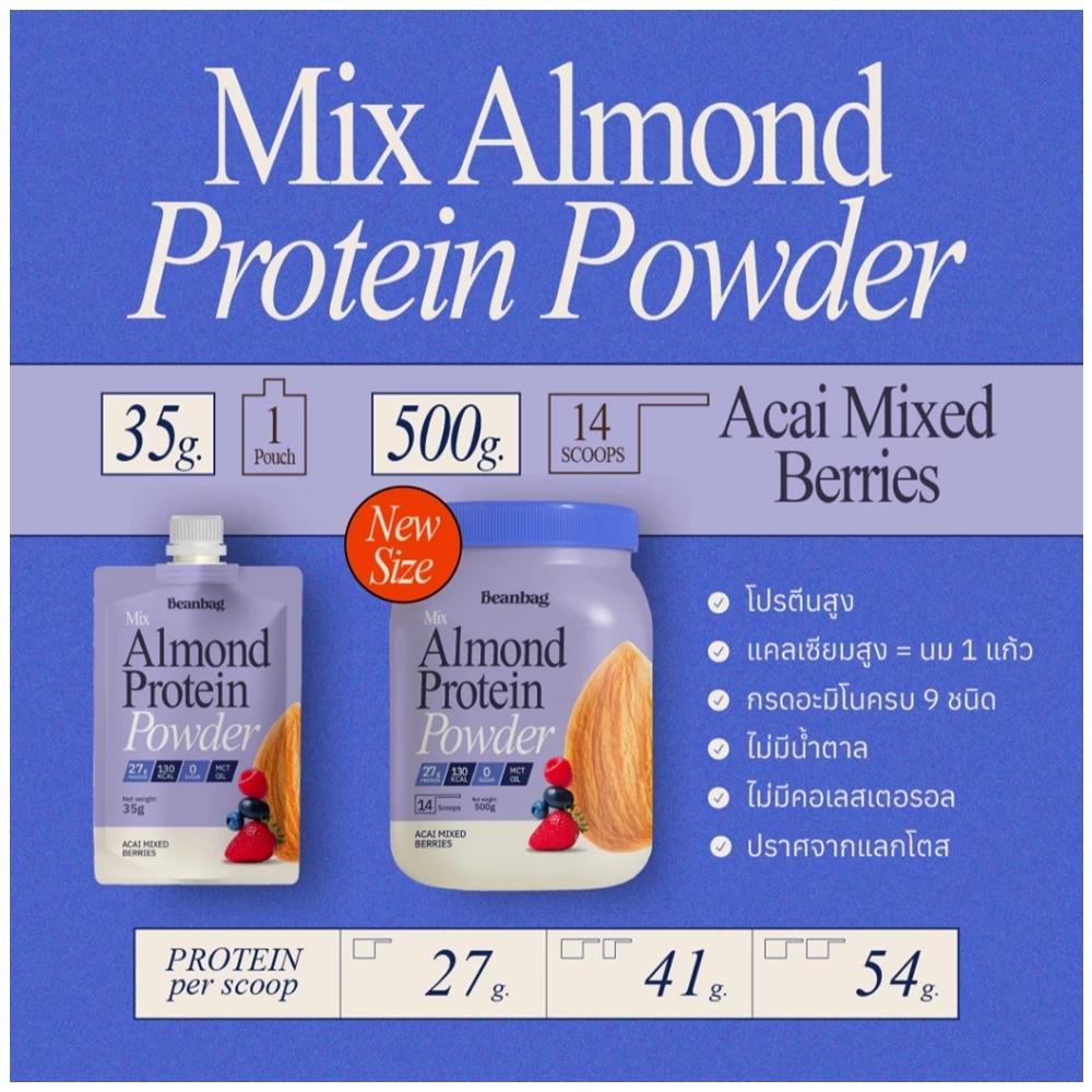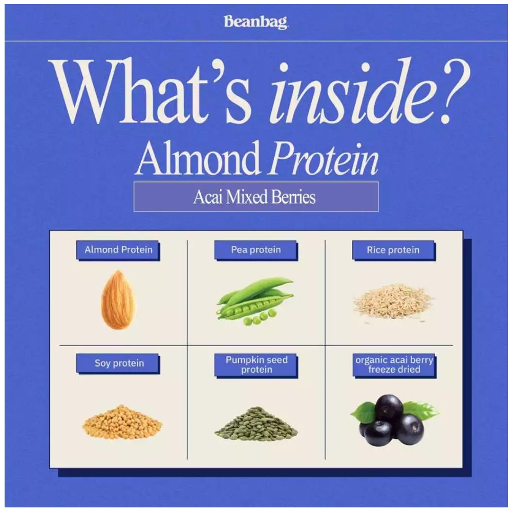 Beanbag Almond Protein Powder รส Acai Mixed berries โปรตีนอัลมอนด์และโปรตีนพืชรวม 5 ชนิด รสอาซาอิมิกซ์เบอร์รี่