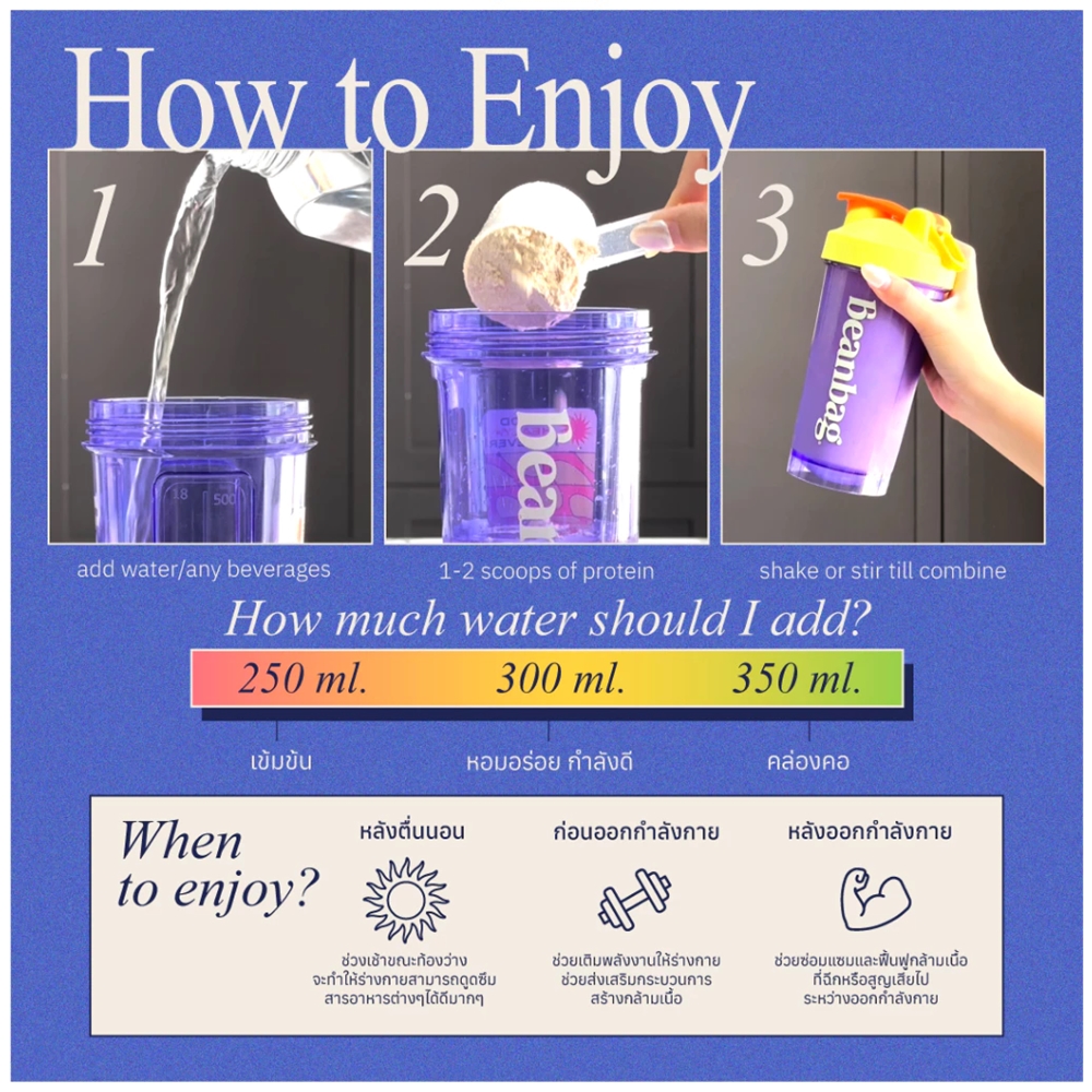 -ตักผงโปรตีน 1 – 1.5 scoop ผสมกับน้ำเย็นหรือนม 300ml แล้วเชคจนเข้ากัน