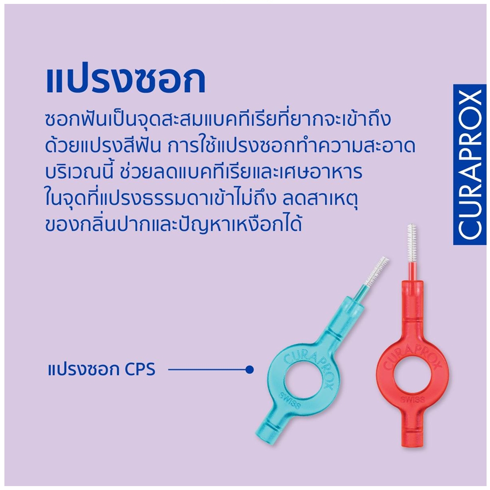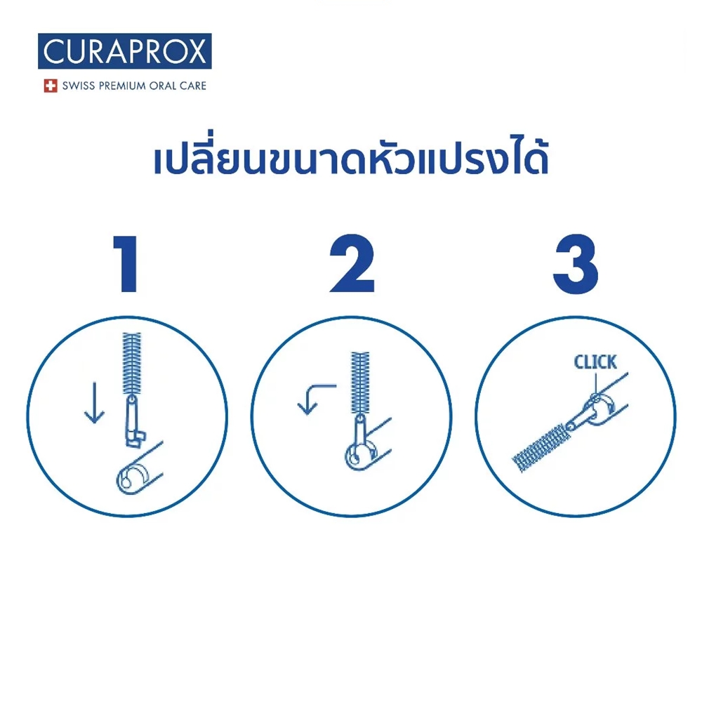 • Click System สามารถเปลี่ยนขนาดของหัวแปรงได้ตามความเหมาะสม และใช้คู่กับด้ามแปรงซอกฟันของ CURAPROX ได้ทุกประเภท