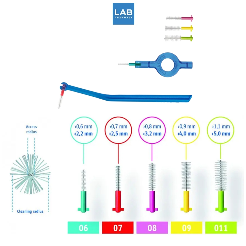 มีแกนลวดให้เลือก 5 ขนาด (0.6, 0.7, 0.8, 0.9, 1.1 มิลลิเมตร) สามารถซอกซอนตามซอกฟัน เพื่อกำจัดเศษอาหารติดค้าง และ แบคทีเรียระหว่างซอกฟันได้ดี