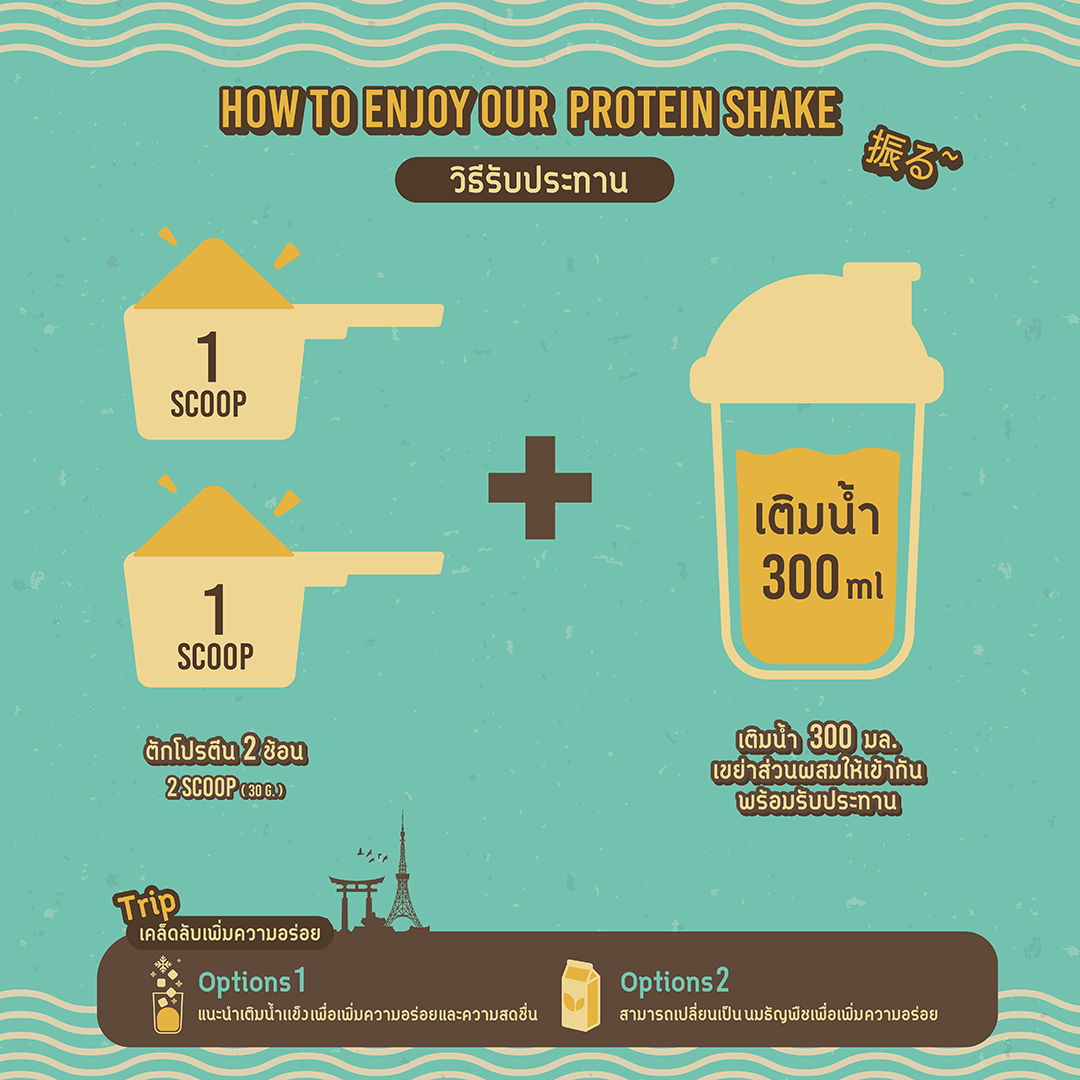 Tips : แนะนำเติมน้ำแข็งเพื่อเพิ่มความอร่อยและความสดชื่น / สามารถเปลี่ยนน้ำ เป็นนมธัญพืชได้