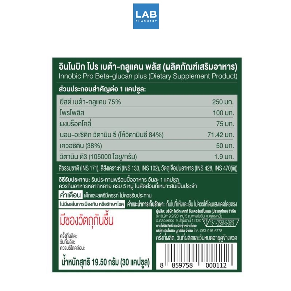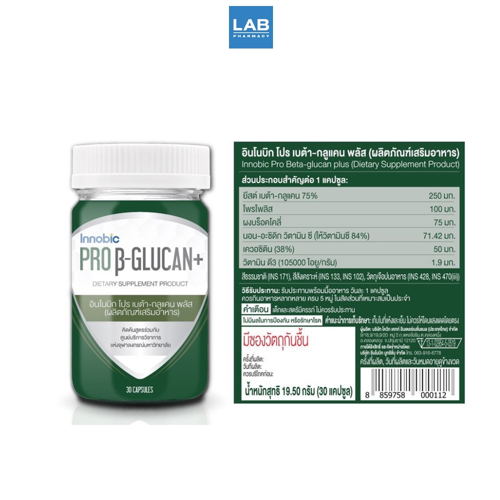 อินโนบิก โปร เบต้า-กลูแคน พลัส (ผลิตภัณฑ์เสริมอาหาร) 1 ขวดบรรจุ 30 แคปซูล