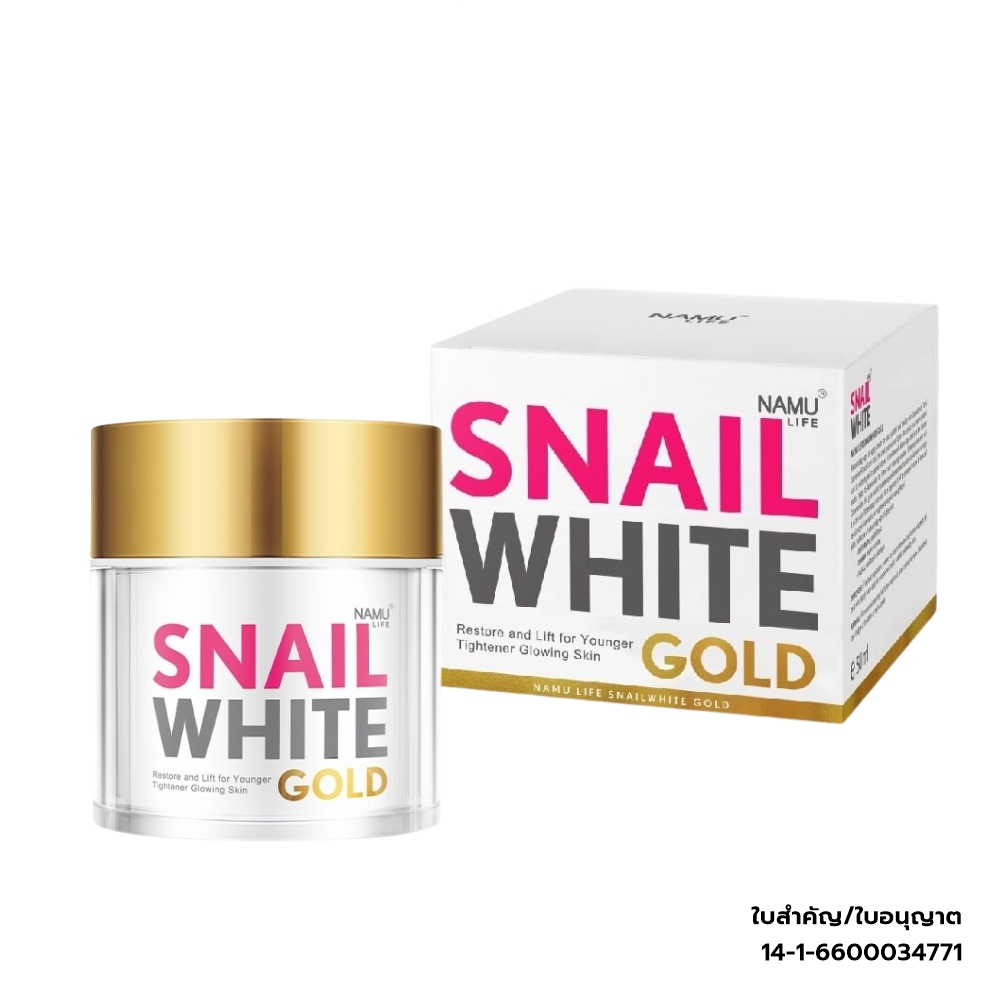 - สเนลไวท์ โกล์ด ครีม ครีมบำรุงผิวหน้าผสานสารสกัดเมือกหอยทาก ผสานสารสกัดจากข้าวสาลี และทองคำบริสุทธิ์ (24K Lipobelle) ช่วยย้อนวัยผิว ฟื้นบำรุงคืนความกระจ่างใส ลดเลือนริ้วรอยให้แลดูจางลง เติม ความชุ่มชื้นให้ผิวเต่งตึง ย้อนวัยผิวเพื่อผิวอ่อนเยาว์และสุขภาพดี ด้วยสารสกัดเมือกหอยทากสายพันธุ์ HELIX ผสาน MICRO-ALGAE สารสกัดจากสาหร่ายสีแดง ที่อยู่ในรูปโครงข่าย Polymer ช่วยพยุงผิวให้ผิวตึงกระชับ ริ้วรอยแลดูจางลง พร้อม CERAMOSIDES HP สารสกัดจากเมล็ดข้าวสาลีฝรั่งเศส ที่ช่วยกระตุ้นกระบวนการเติมน้ำให้ผิว ทำให้ผิวนุ่มชุ่มชื้น ดูอิ่มฟู และกระจ่างใสเหมือนเด็กแรกสาว
